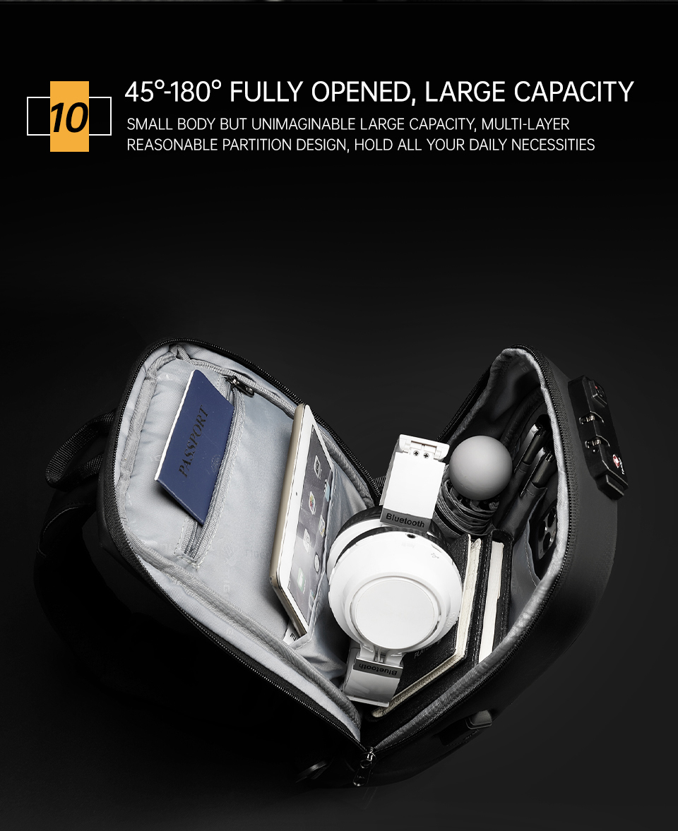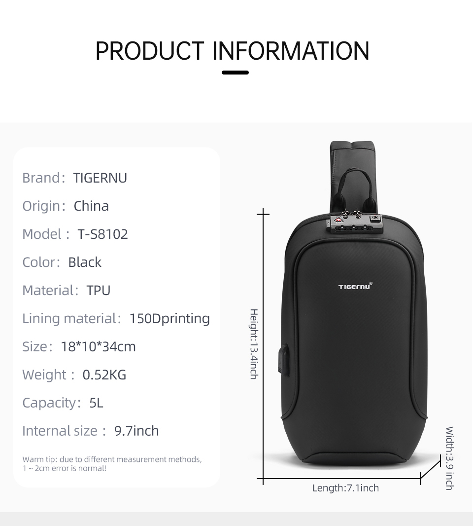 Tigernu High Quality Waterproof USB TSA Coded Lock shoulder chest Bag
